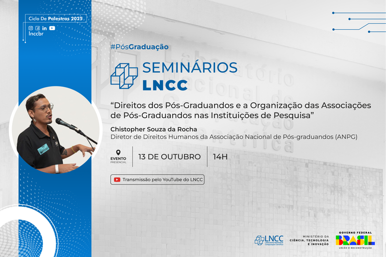 O Programa de Pós-graduação do LNCC convida a todos para a palestra: “Direitos dos Pós-graduandos e a Organização das Associações de Pós-graduandos nas Instituições de Pesquisa”, com o Diretor de Direitos Humanos da Associação Nacional de Pós-graduandos (ANPG), Christopher Souza da Rocha. O evento será aberto ao público e gratuito, tendo lugar no Auditório A do LNCC, com transmissão simultânea pelo canal do YouTube do laboratório.