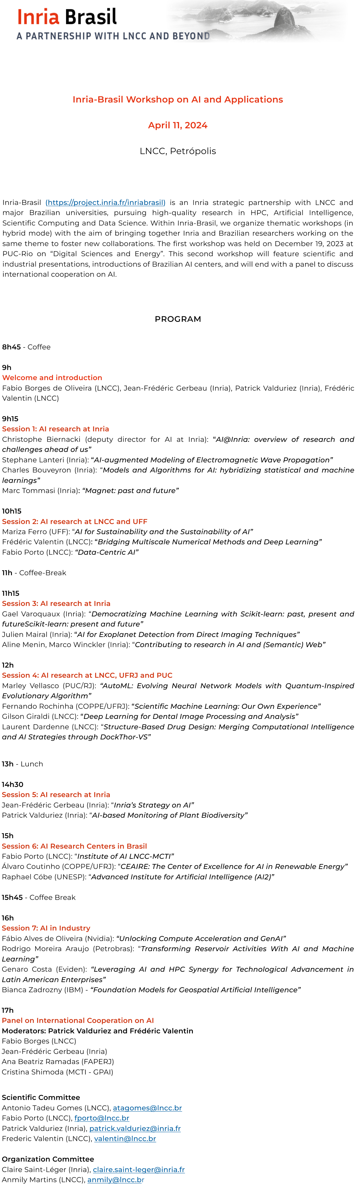 O programa estratégico Inria-Brasil (https://project.inria.fr/inriabrasil), é uma parceria do INRIA com o LNCC e as principais universidades brasileiras com o objetivo de realizar pesquisas de alta qualidade em HPC, Inteligência Artificial, Computação Científica e Ciência de Dados.