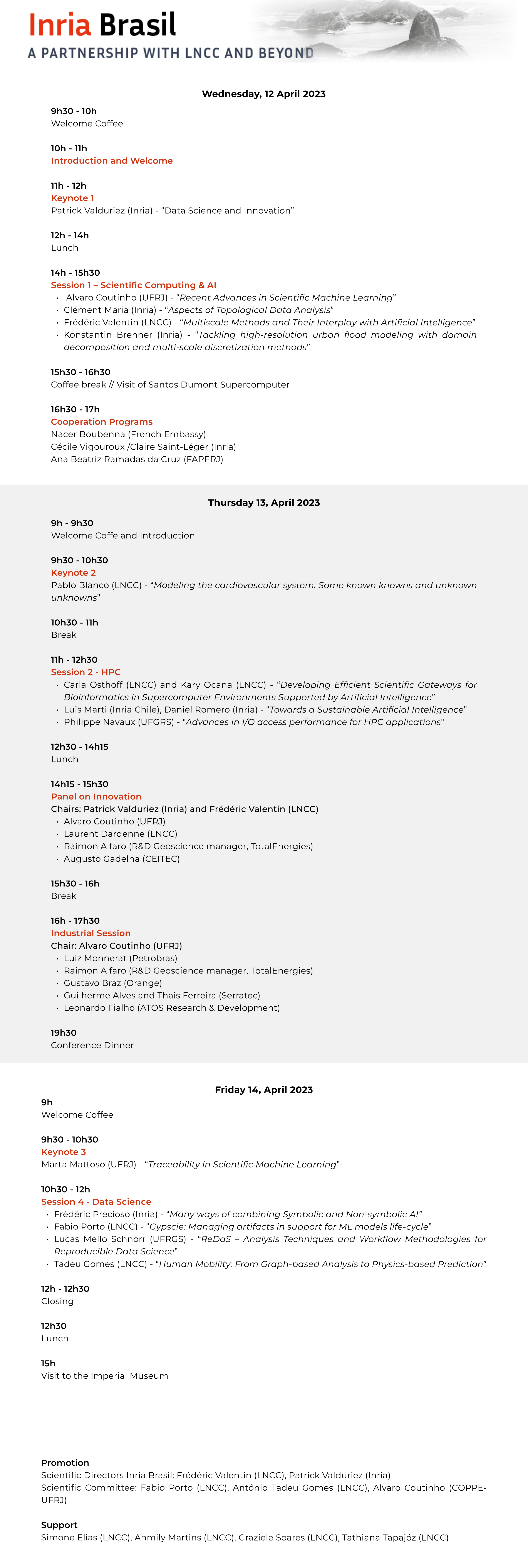 Como desdobramento do sucesso do MoU organiza-se no LNCC de 12-14 de abril, em conjunto com o INRIA e a COPPE/UFRJ, o Evento INRIA-Brasil no qual os grupos de pesquisa brasileiros com colaborações com o INRIA apresentarão seus trabalhos de pesquisa. As seções técnicas são complementadas por mesas redondas nos temas inovação e indústria, com a participação de representantes da indústria brasileira e francesa. Durante o encontro, acontecerá a assinatura entre o INRIA e o LNCC de um acordo que formaliza a criação de um novo e amplo escopo de colaboração com o LNCC, tornando o LNCC o principal interlocutor e facilitador nacional das colaborações dos grupos de pesquisa brasileiros com o INRIA.