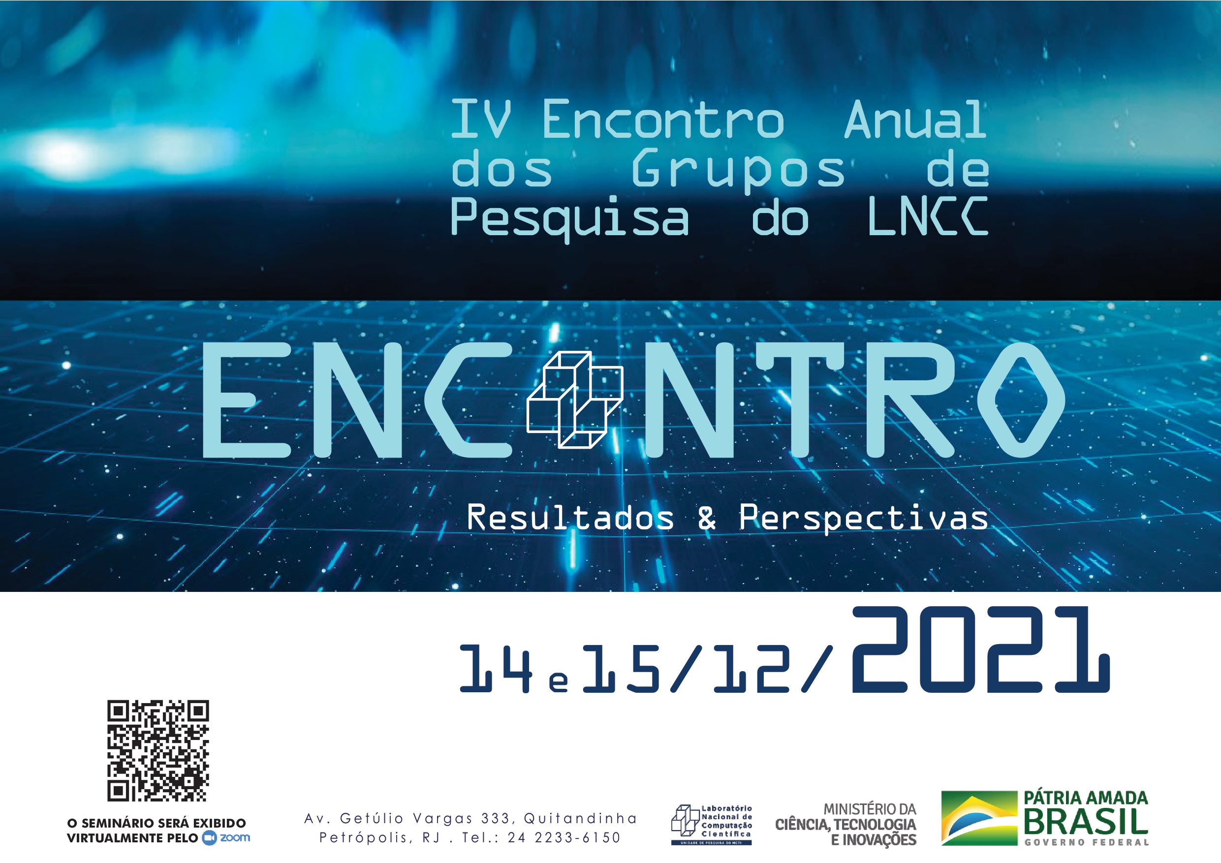 Entre os dias 14 e 15 de dezembro o Laboratório Nacional de Computação Científica realizará o IV Encontro dos Grupos de Pesquisa do LNCC. O evento tem como objetivo consolidar um fórum de divulgação e discussão das pesquisas e desenvolvimentos realizados na instituição em 2021, promovendo um maior conhecimento das atividades dos grupos de pesquisa LNCC e discutindo desafios e metas a serem alcançadas em 2022.