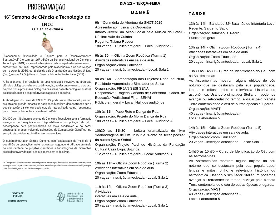 Veja aqui a programação da Semana Nacional de Ciência e Tecnologia (SNCT 2019) que será realizada na sede do LNCC, de 22 a 24 de outubro .