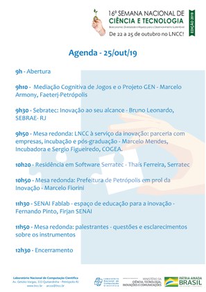 Dentro da programação da Semana Nacional de Ciência e Tecnologia (SNCT 2019), o LNCC realiza no dia 25 de outubro, em sua sede, o Workshop Sinergias do Ecossistema de Inovação em Petrópolis .
