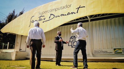 À esquerda, o diretor do LNCC, Augusto Gadelha , ao centro o secretário executivo do Ministério da Ciência, Tecnologia e Inovações - MCTI, Leônidas Medeiros e à direita, o diretor substituto e coordenador de Tecnologia da Informação e Comunicação - COTIC, Wagner Vieira Léo, em frente ao Supercomputador Santos Dumont.
