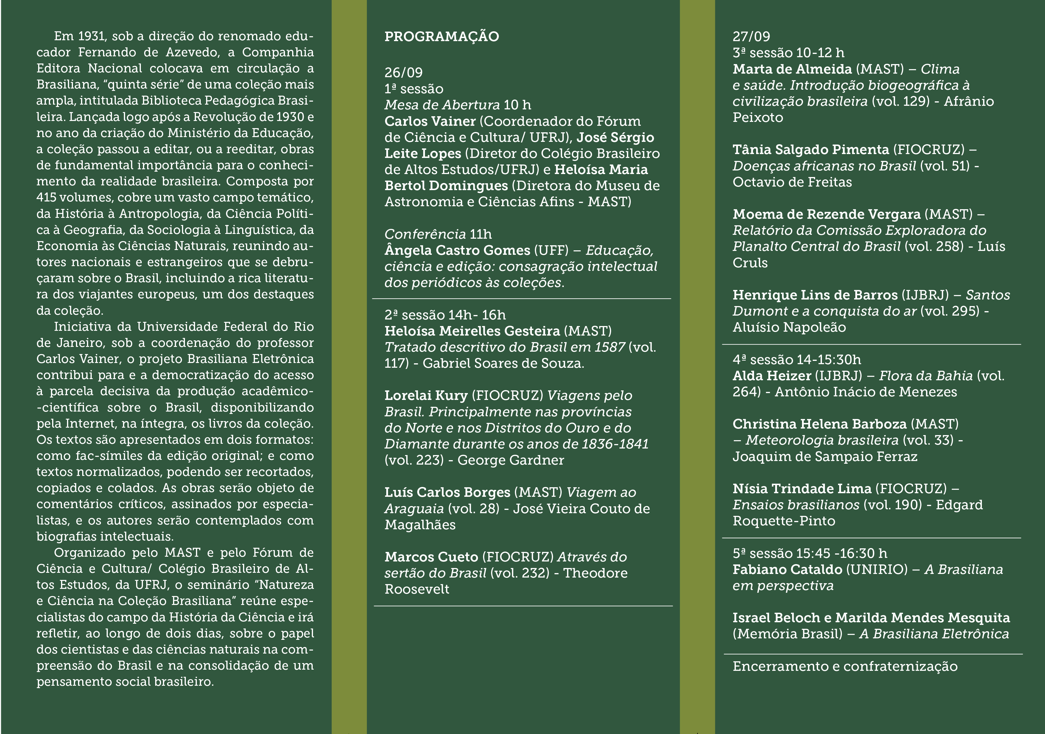Organizado pelo MAST e pelo Fórum de Ciência e Cultura/ Colégio Brasileiro de Altos Estudos, da UFRJ, o seminário “Natureza e Ciência na Coleção Brasiliana” reúne especialistas do campo da História da Ciência e irá refletir, ao longo de dois dias, sobre o papel dos cientistas e das ciências naturais na compreensão do Brasil e na consolidação de um pensamento social brasileiro.
