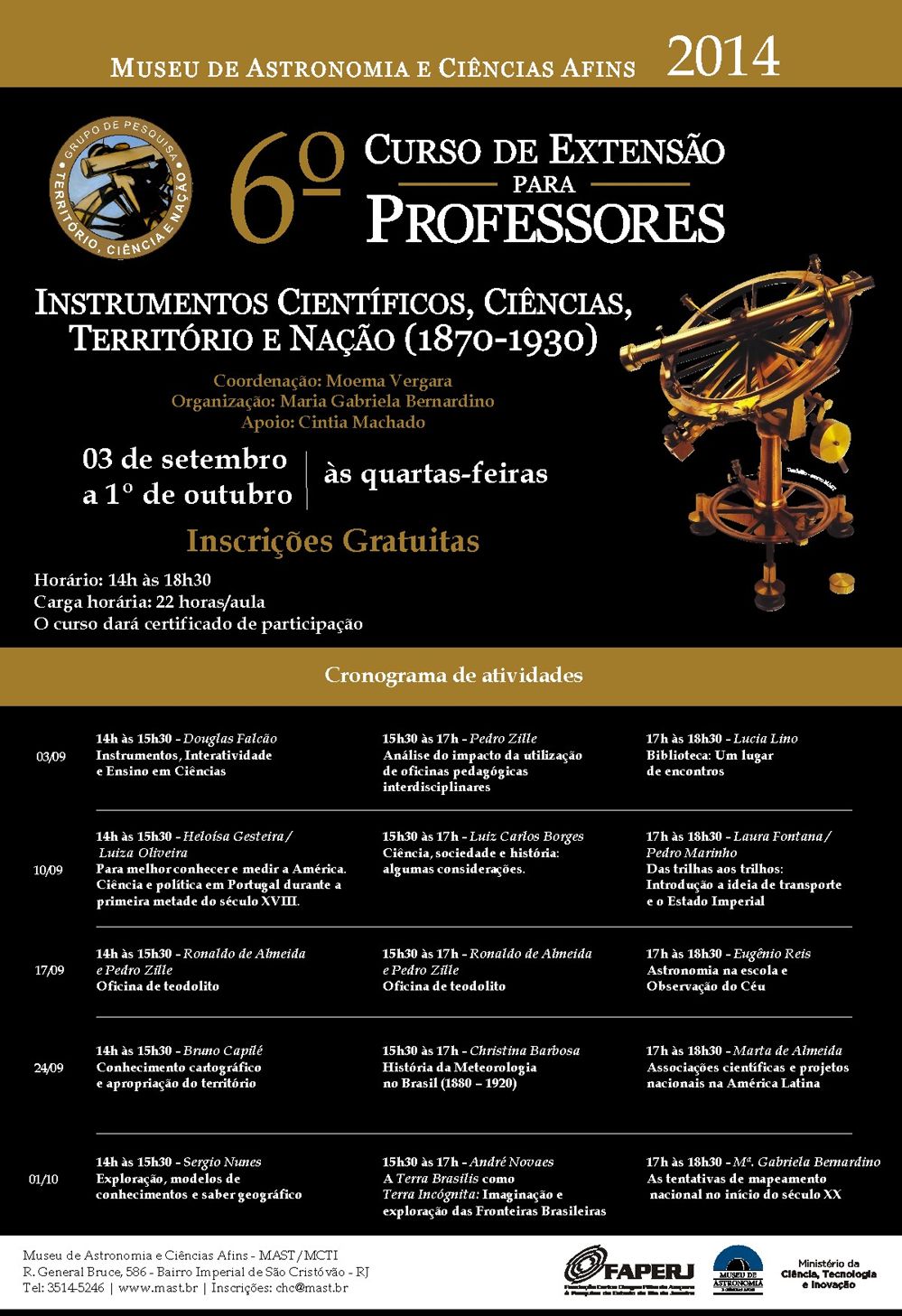 O 6º Curso de Extensão para professores, Instrumentos Científicos, Ciências, Território e Nação (1870-1930), tem como coordenadora Moema Vergara, como organizadores, Maria Gabriela Bernardino e Cintia Machado, e o apoio da FAPERJ - Fundação de Amparo à Pesquisa do Estado do Rio de Janeiro.