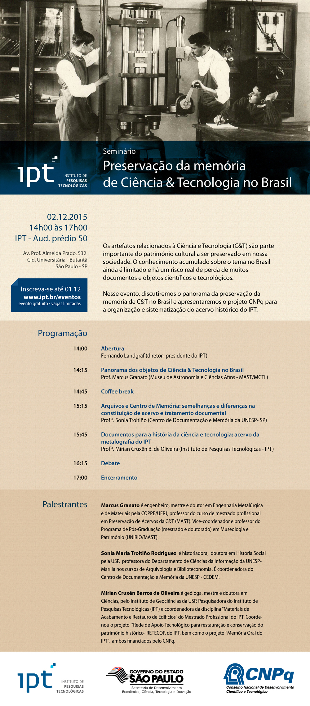 Nesse evento, será discutido o panorama da preservação da memória de Ciência e Tecnologia (C&T) no Brasil e apresentado o projeto CNPq para a organização e sistematização do acervo histórico do Instituto de Pesquisas Tecnológicas (IPT).