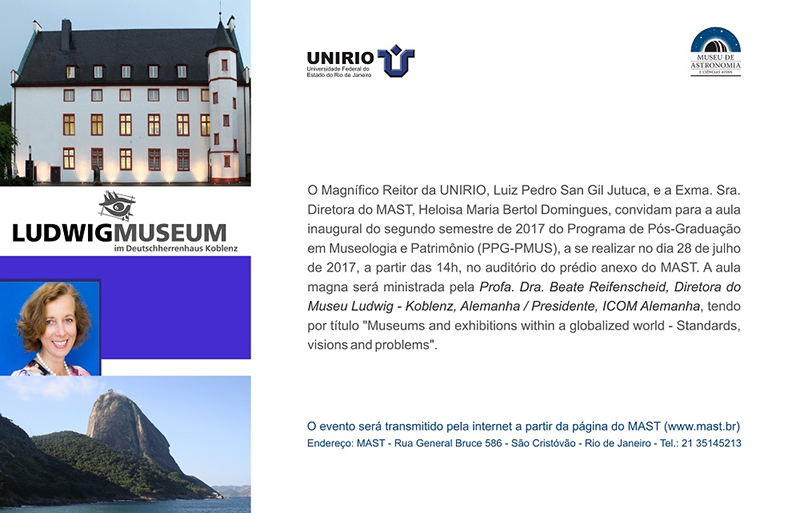 O evento, que marca o 11º Aniversário do Programa, conta com a aula magna ministrada pela professora e doutora Beate Reifenscheid , diretora do Ludwig Museum em Koblenz, na Alemanha, tendo como título " Museums and exhibitions within a globalized world - Standards, visions and problems ". A aula acontecerá a partir das 14h, no auditório do prédio anexo do Mast (Rua General Bruce, 586, São Cristóvão). Haverá transmissão ao vivo, pela internet, a partir da página do Museu.