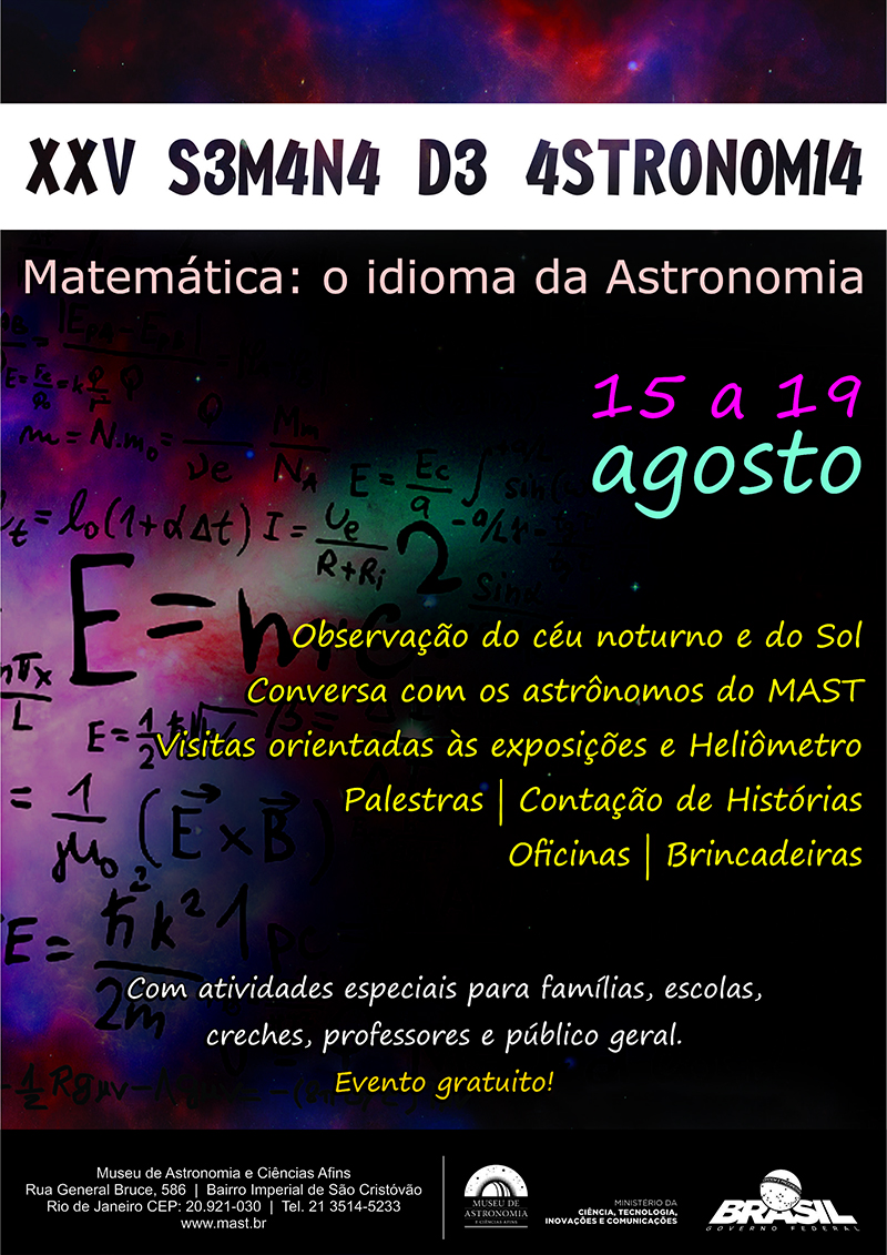 Entre os dias 15 e 19 de agosto, o Museu de Astronomia e Ciências Afins (MAST) promove a XXV Semana de Astronomia (SEMA) que, neste ano em que se comemora o Biênio da Matemática , terá como tema “ Matemática: o idioma da Astronomia ”. Durante os quatro dias de evento, o público poderá conhecer as mais recentes descobertas da ciência, por meio de atividades interativas e palestras com especialistas da área científica. Além disso, para entreter os participantes, serão realizadas diversas atrações que buscam explicar a ciência de uma forma mais lúdica, a exemplo das oficinas de astronomia dirigidas para crianças, jovens e adultos, visitas orientadas à exposições e mini-cursos.