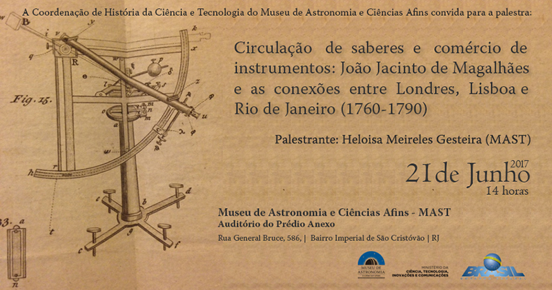 O tema das viagens e deslocamentos dos instrumentos científicos é cada vez mais explorado no campo da História das Ciências em geral, e em particular, na História da Astronomia. Para entender mais sobre isso, a historiadora Heloisa Meireles Gesteira realiza no próximo dia 21, a palestra " Circulação de saberes e comércio de Instrumentos ", onde apresenta seus estudos sobre o comércio de instrumentos científicos durante a segunda metade do século XVIII.