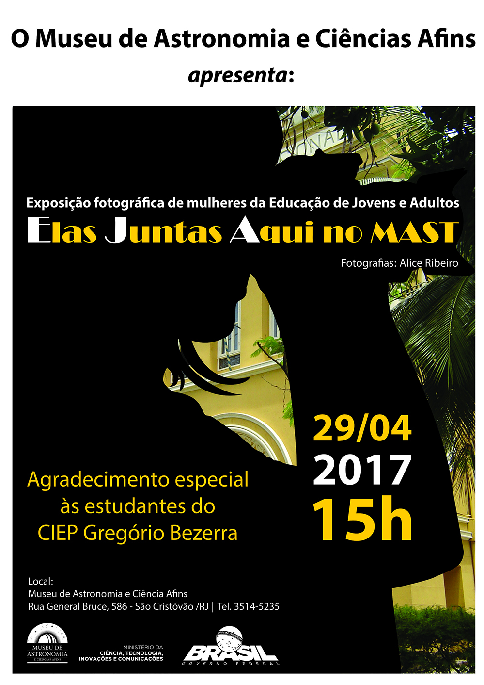 O Museu de Astronomia e Ciências Afins (MAST) inaugura, no dia 29 de abril, às 15 h, a exposição Elas Juntas Aqui no MAST. A mostra fotográfica reúne trabalhos de mulheres estudantes do CIEP Gregório Bezerra, localizado na Penha, RJ. O objetivo é valorizar as mulheres e suas conquistas na luta diária pelo direito à educação. Todas fazem parte do projeto Educação de Jovens e Adultos (EJA), iniciativa pública que oferece ensino gratuito para pessoas que não concluíram o ensino fundamental ou médio na idade apropriada. O Museu fica na Rua General Bruce, 586, São Cristovão, RJ. A entrada é gratuita.