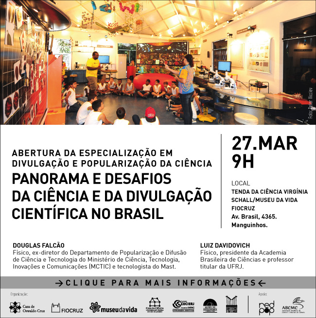 Na próxima segunda-feira, dia 27 de março, às 9h, será realizada a abertura do Curso de Especialização em Divulgação e Popularização da Ciência, resultado da colaboração entre o Museu da Vida (Casa de Oswaldo Cruz/Fiocruz), Museu de Astronomia e Ciências Afins (MAST), Casa da Ciência da Universidade Federal do Rio de Janeiro (UFRJ), Fundação Cecierj e do Jardim Botânico do Rio de Janeiro, com apoio da Rede de Popularização da Ciência e da Tecnologia da América Latina e do Caribe (RedPOP) e da Associação Brasileira de Centros e Museus de Ciência (ABCMC).