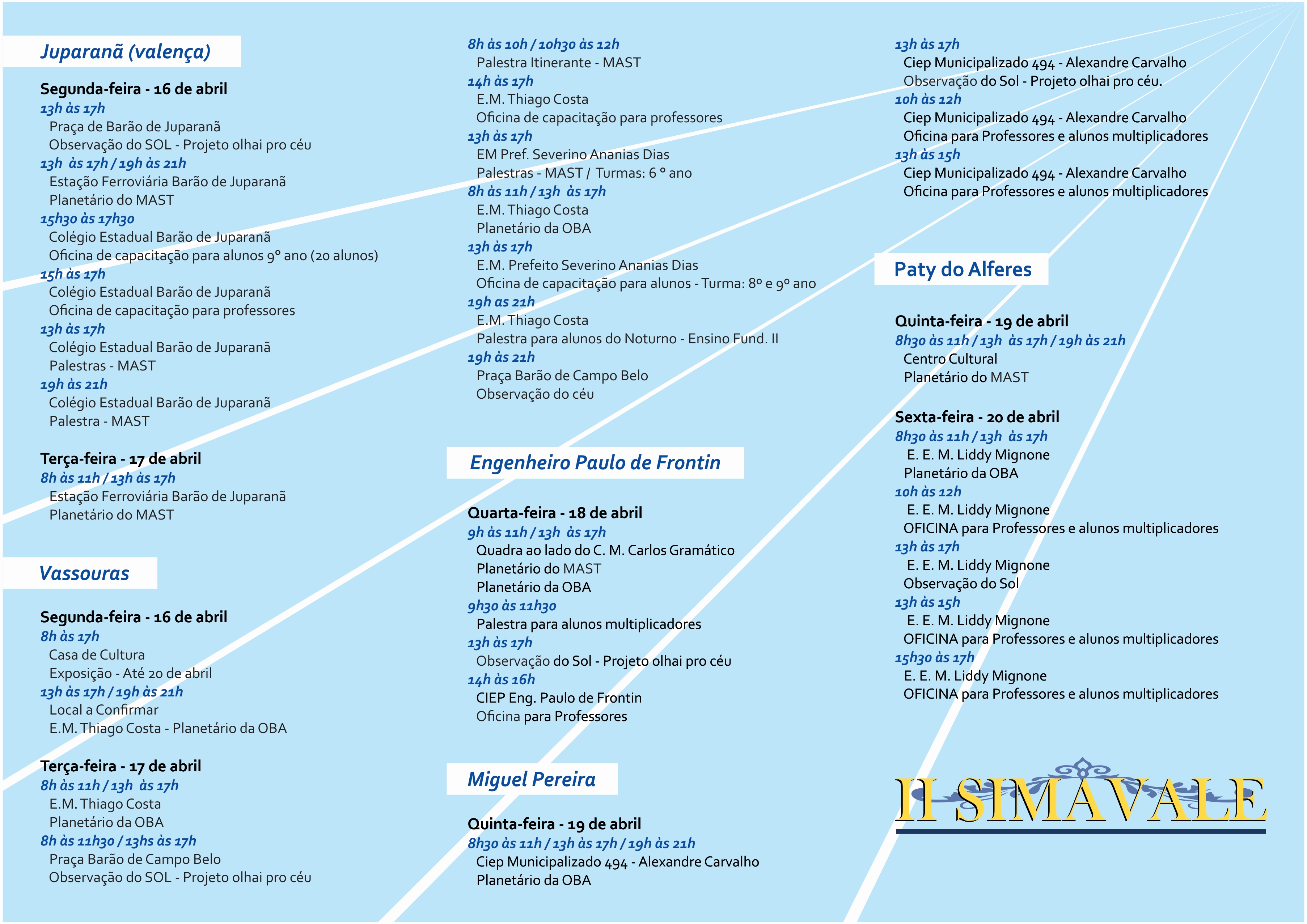 O evento acontece nos municípios de Juparanã (Valença), Vassouras, Engenheiro Paulo de Frontin, Miguel Pereira e Paty do Alferes, e visa realizar atividades de popularização e divulgação da astronomia para alunos e professores das redes municipal e particular de ensino na região Sul Fluminense.