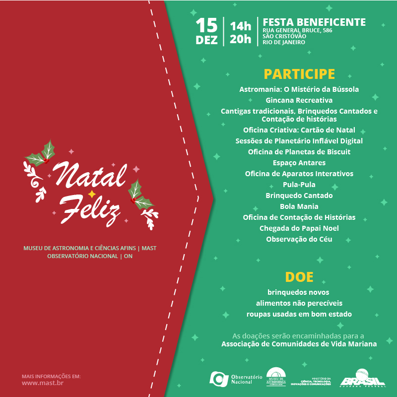 Neste Natal, junte-se ao MAST e ao Observatório Nacional na campanha de arrecadação de brinquedos, alimentos e roupas preferencialmente masculinas (mesmo usadas, desde que estejam em bom estado de conservação) para ser entregue.