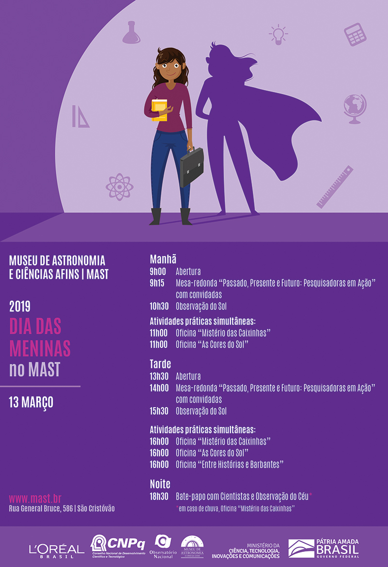 Ao longo dos anos, as mulheres foram protagonistas na construção do pensamento científico e importantes para o desenvolvimento e o avanço da ciência e da sociedade. Porém, hoje em dia ainda é preciso quebrar paradigmas para ampliar a pouca participação das mulheres nas áreas de exatas. Com esse pensamento, a Coordenação de Educação em Ciências do Museu de Astronomia e Ciências Afins criou o Dia das Meninas, idealizado para incentivar as jovens a se interessar pelas ciências.