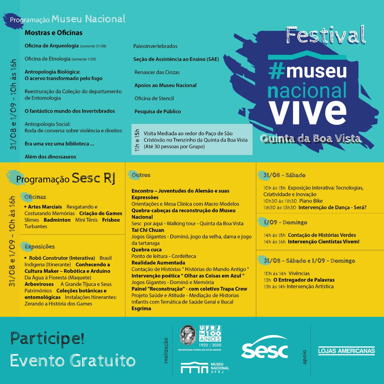 Resistir, lutar e reexistir! Esse é um dos lemas da reconstrução do Museu Nacional após o incêndio de grandes proporções que atingiu a sua sede na noite de 2 de setembro de 2018. Para mostrar que, apesar da tragédia que destruiu parte do acervo, a instituição segue trabalhando, a equipe Museu Nacional, em parceria com o SESC RJ, promove o Festival Museu Nacional Vive. O evento acontece neste sábado (31/08) e domingo (01/09), das 10h às 16h, na Quinta da Boa Vista, e oferece ao público diferentes atividades interativas promovidas por pesquisadores da instituição e por colaboradores das unidades do SESC no Rio de Janeiro.