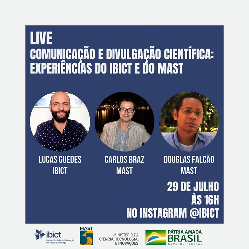 O Instituto Brasileiro de Informação em Ciência e Tecnologia (IBICT) convidou o Museu de Astronomia e Ciências Afins (MAST) para um debate sobre as ações de divulgações desenvolvidas na instituição para disseminar o conhecimento cientifico ao público. A live acontece nesta quarta-feira (29), às 16h, no Instagram do IBICT . O bate-papo conta com a participação de Lucas Guedes , jornalista e pesquisador do IBICT, Carlos Braz , assessor de imprensa do MAST, e Douglas Falcão , tecnologista da Coordenação de Educação em Ciências do MAST.