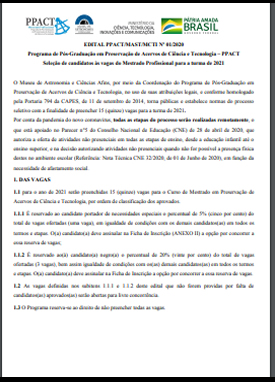 O Museu de Astronomia e Ciências Afins, por meio da Coordenação do Programa de Pós-Graduação em Preservação de Acervos de Ciência e Tecnologia ( PPACT) , torna pública e estabelece as normas do processo seletivo com a finalidade de preencher 15 (quinze) vagas para a turma de 2021. Por conta da pandemia do novo coronavirus, todas as etapas do processo serão realizadas remotamente (Conforme parecer n°5 do Conselho Nacional de Educação de 28 de abril de 2020), que autoriza a oferta de atividades não presenciais em todas as etapas de ensino, desde a educação infantil até o ensino superior, e na decisão autorizando atividades não presenciais quando não for possível a presença física destes no ambiente escolar, em função da necessidade de afastamento social.