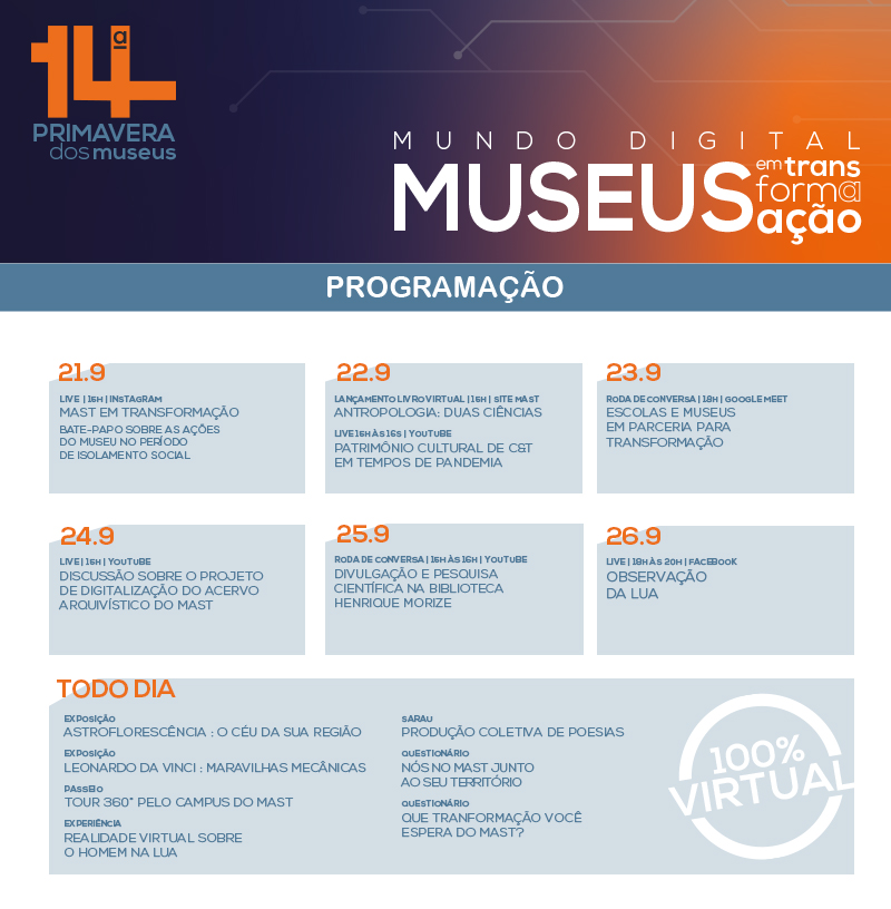 Entre os dias 21 a 27 de setembro , acontece a 14ª edição da Primavera dos Museus , temporada cultural coordenada pelo Instituto Brasileiro de Museus (IBRAM). O tema definido para a edição de 2020 é: “Mundo Digital: Museus em Transformação”.