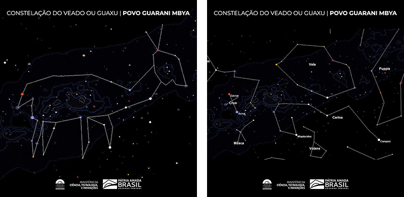 A Constelação do Veado ou Guaxu (fig I) representa o outono para os Guarani. A constelação situa-se em uma área que abrange as seguintes constelações ocidentais: Cruzeiro do Sul, Vela, Mosca e Carina (fig I.a).