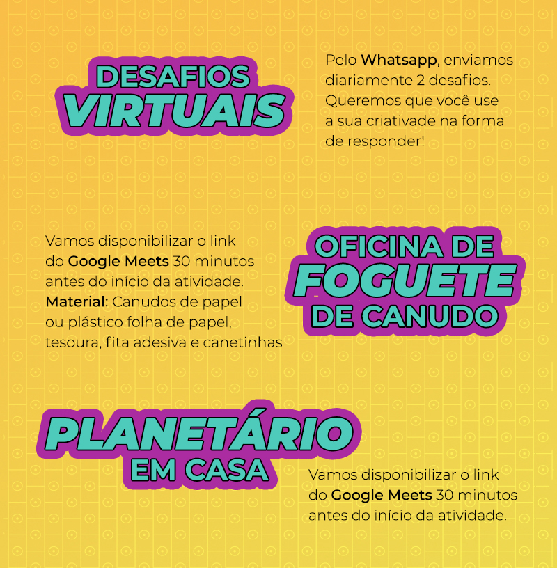 A iniciativa conta com atividades virtuais e oferece opções atrativas que aliam entretenimento e ciência, dialogando com as novas gerações conectadas e promovendo conhecimento com muita diversão on-line . A edição 2021 acontece entre os dias 1 e 5 de fevereiro e oferece desafios, quiz, oficinas e até o Planetário Digital ao vivo em sua casa. Também haverá a Gincana de Verão que, ao longo de toda a semana, permite que o público compartilhe os resultados dos desafios, além de fotos vídeos e imagens produzidas nas variadas brincadeiras. Há limitação de 100 pessoas para participar das atividades, portanto é preciso realizar inscrição por meio do Formulário On-line (inscrições encerradas) .
