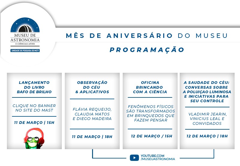 Na semana de celebração pelos 36 anos do Museu de Astronomia e Ciências Afins (MAST), a programação de aniversário segue presenteando o público com uma série de conteúdos que unem diversão e conhecimento. E por ser uma data especial, as atividades oferecidas presencialmente pelo Museu foram adaptadas para o mundo virtual:
