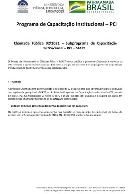 O Museu de Astronomia e Ciências Afins (MAST) abre a segunda chamada para a Seleção de Bolsas no Programa de Capacitação Institucional (PCI). Serão disponibilizadas até 12 bolsas para especialistas que contribuam para a execução de projetos de pesquisa, visando apoiar os Programas de Pesquisa do MAST.