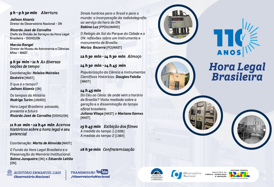 No próximo dia 27 de novembro, o Observatório Nacional, unidade de pesquisa do Ministério da Ciência, Tecnologia e Inovação (ON/MCTI), celebrará os 110 anos da Hora Legal Brasileira (HLB), com um evento especial realizado em parceria com o Museu de Astronomia e Ciências Afins (MAST).