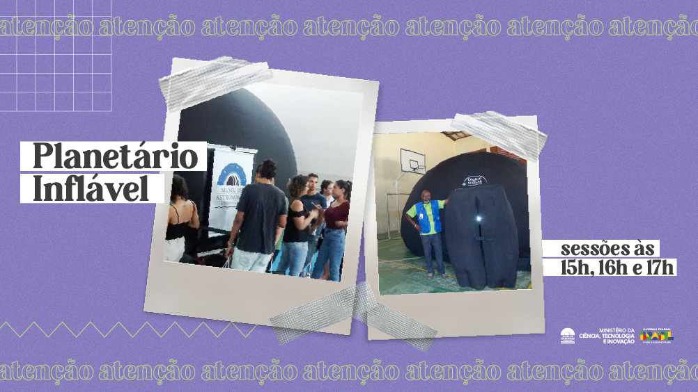 15h, 16h e 17h - Sessões do planetário inflável, com distribuição de 25 senhas 30 minutos antes do evento.