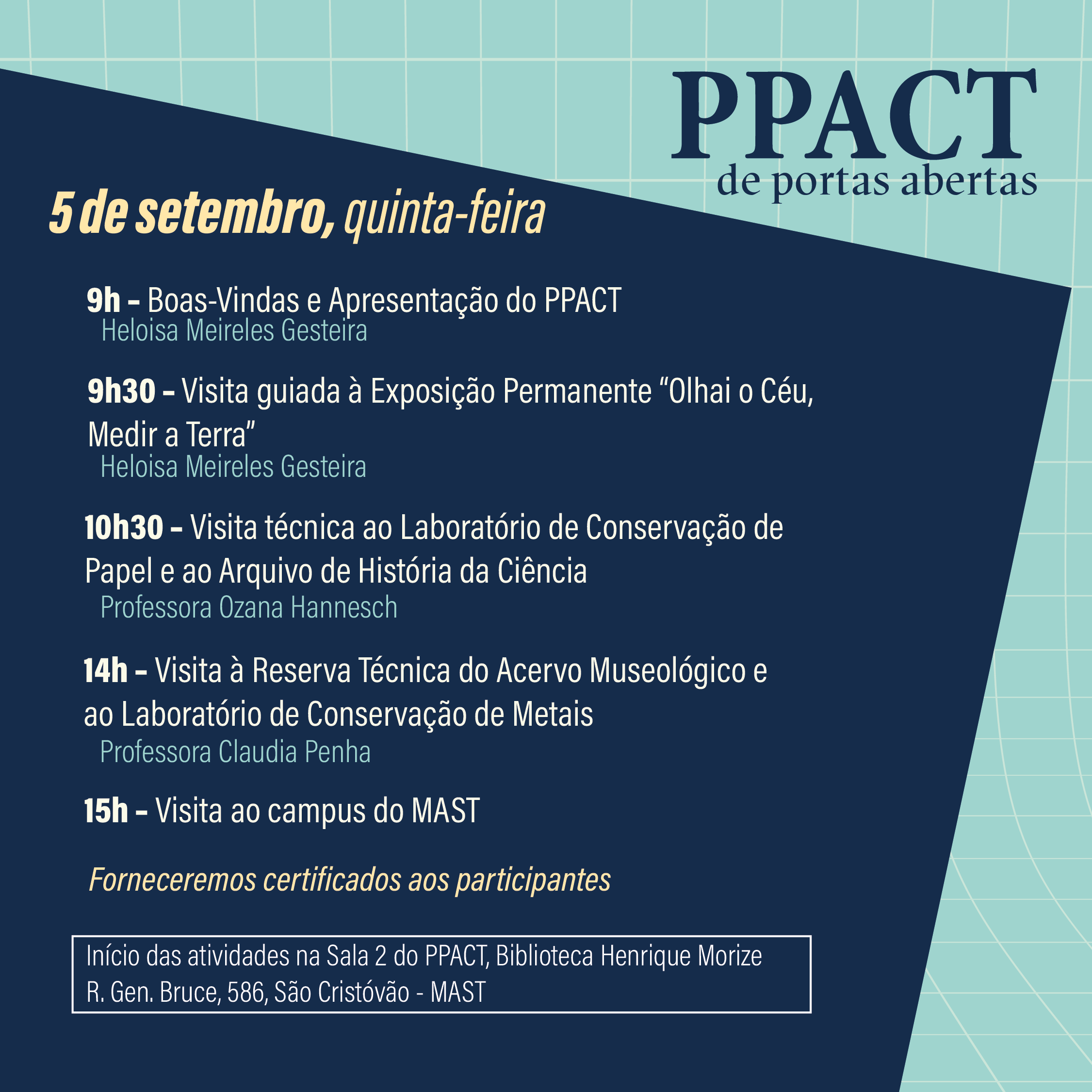 Toda a programação será realizada na Sala 2 do PPACT, localizada na Biblioteca Henrique Morize, na Rua General Bruce, 586, São Cristóvão.