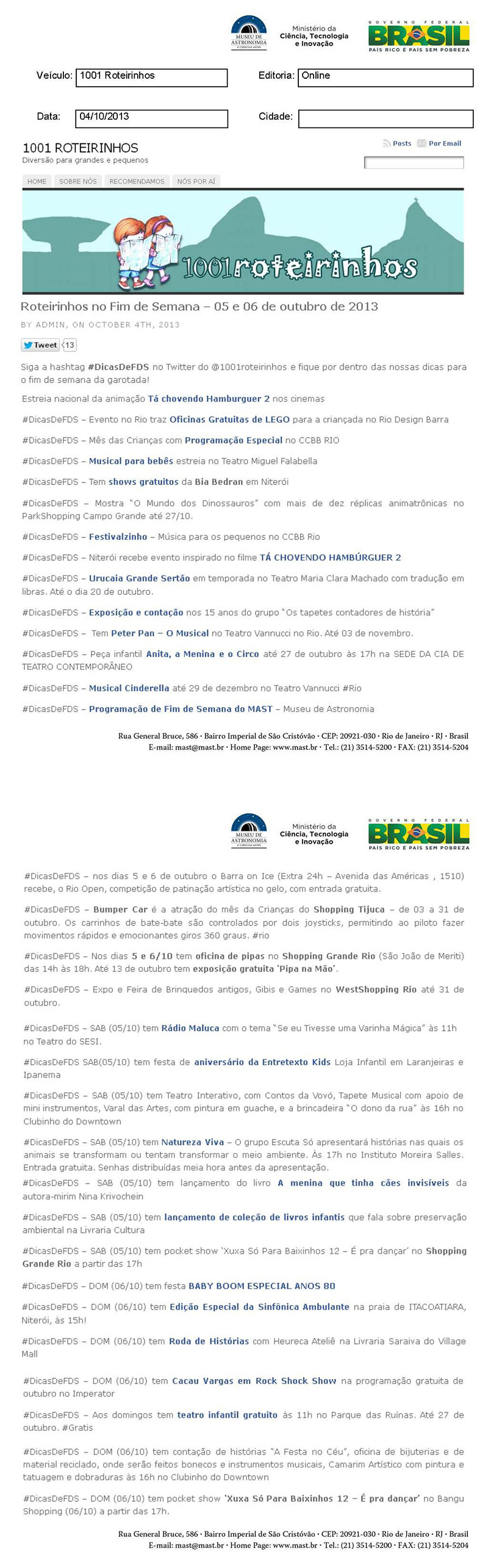 1001 Roteirinhos | Roteirinhos no Fim de Semana - 05 e 06 de outubro de 2013