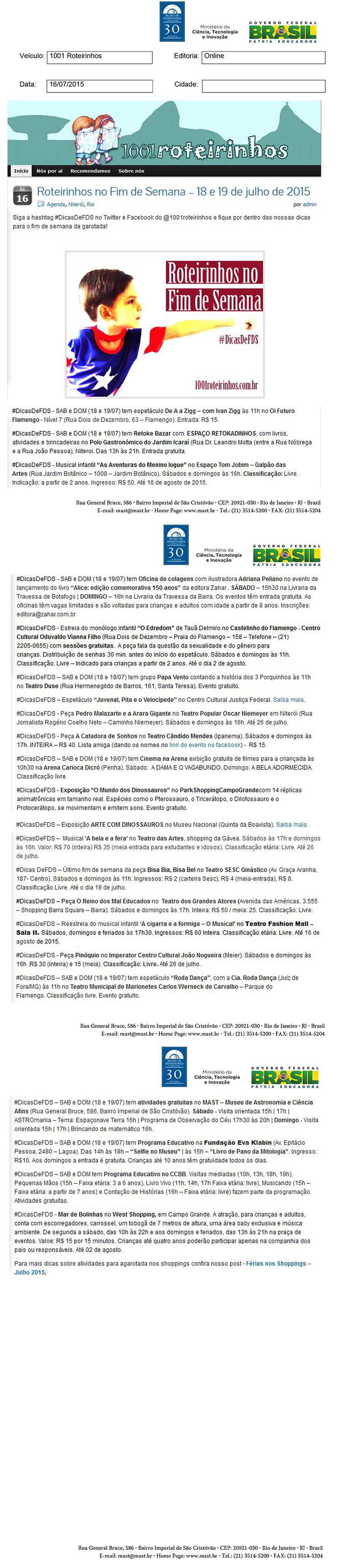 1001 Roteirinhos | Roteirinhos no Fim de Semana - 18 e 19 de julho de 2015