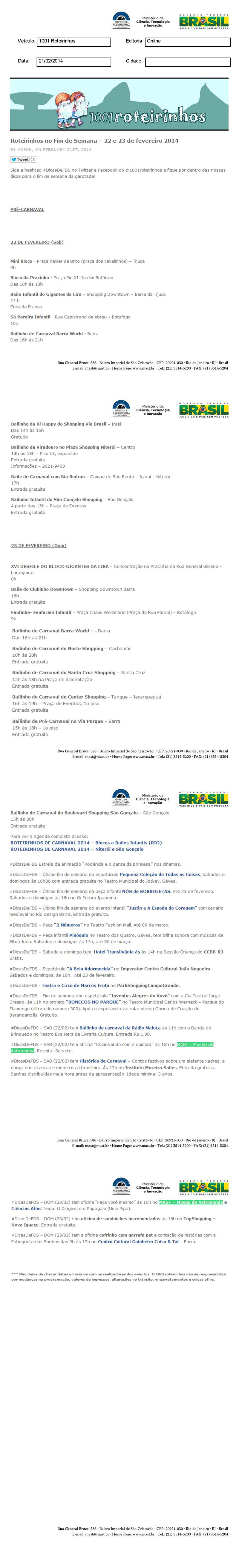 1001 Roteirinhos | Roteirinhos no Fim de Semana - 22 e 23 de fevereiro 2014