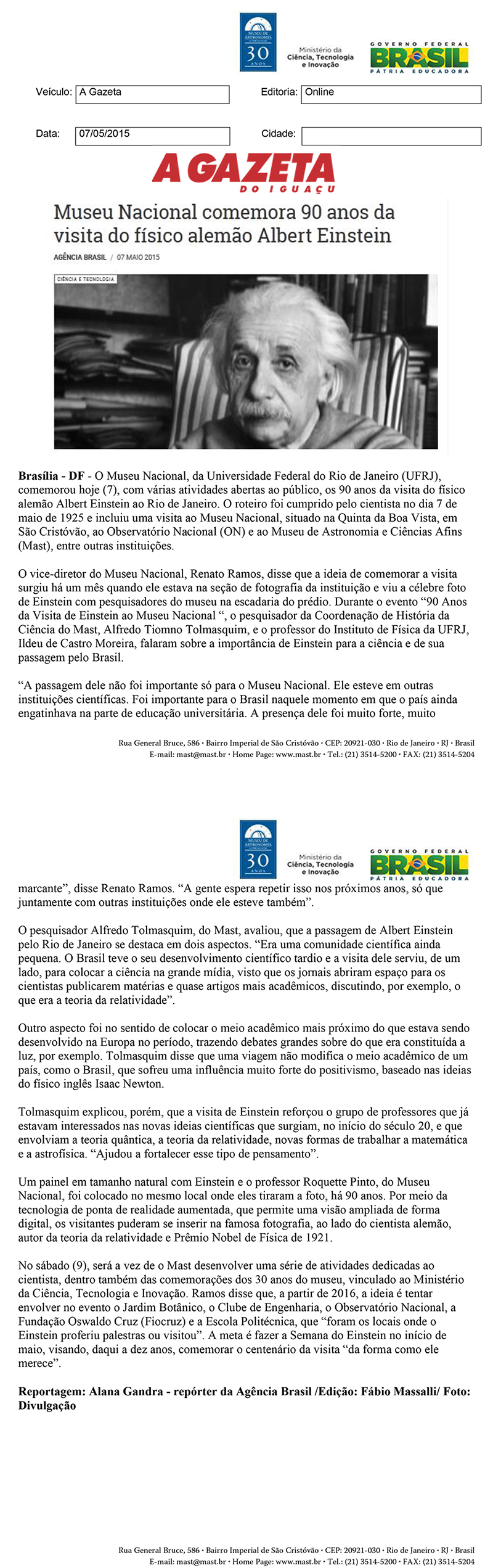 A Gazeta do Iguaçu | Museu Nacional comemora 90 anos da visita do físico alemão Albert Einstein
