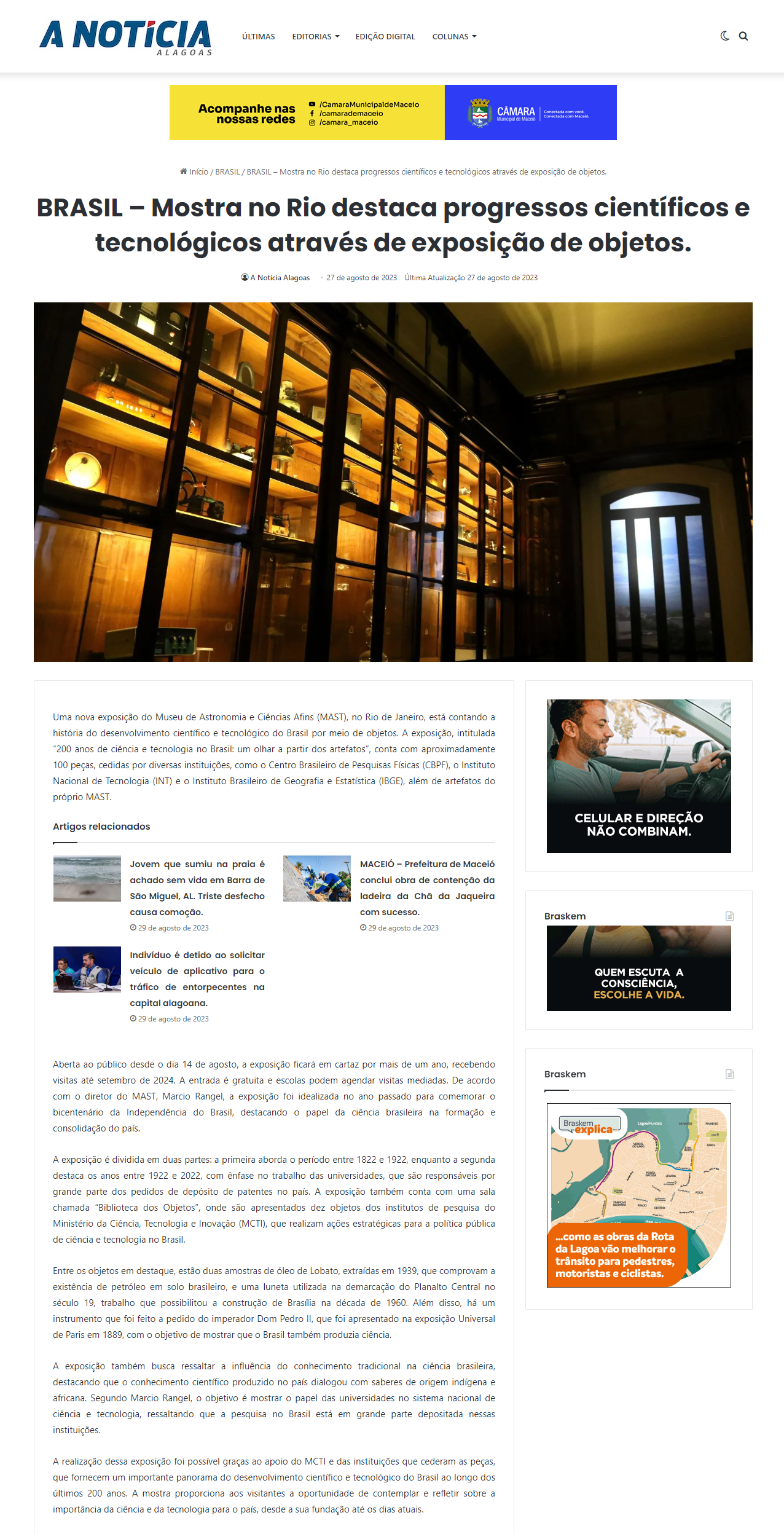 A Notícia (Alagoas) - Mostra no Rio destaca progressos científicos e tecnológicos através de exposição de objetos