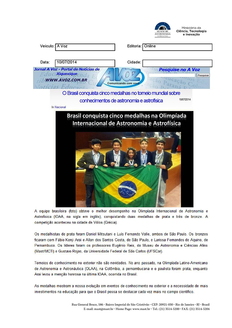 A Voz | Brasil conquista cinco medalhas na Olimpíada Internacional de Astronomia e Astrofísica