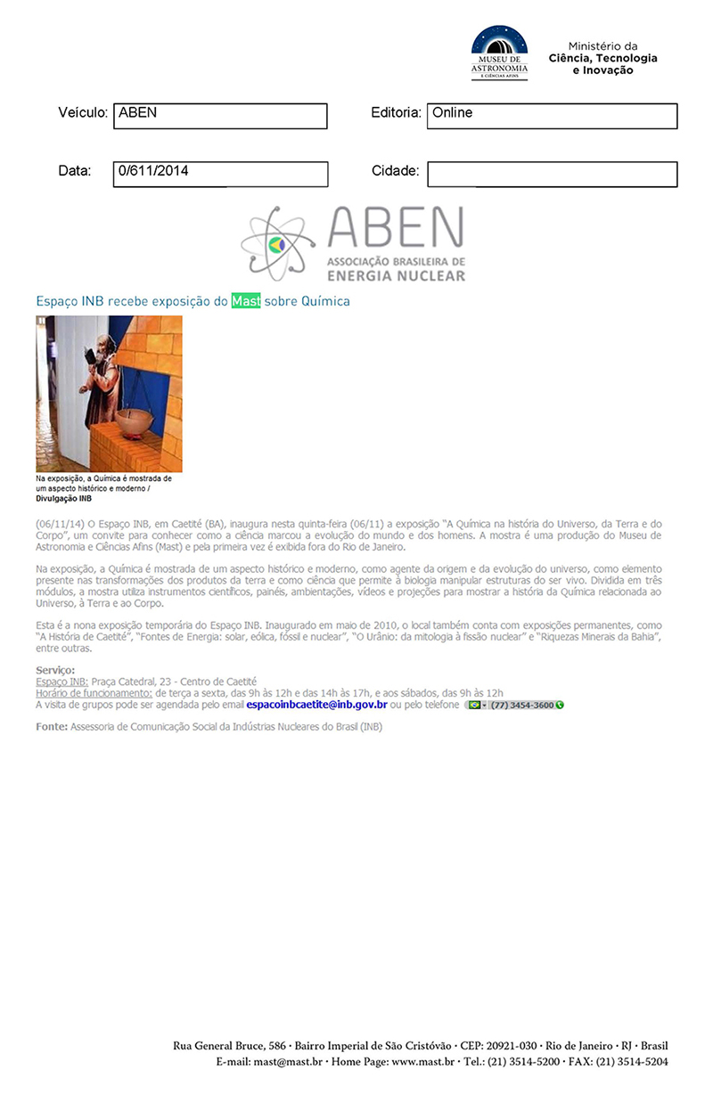 ABEN | Espaço INB recebe exposição do MAST sobre Química