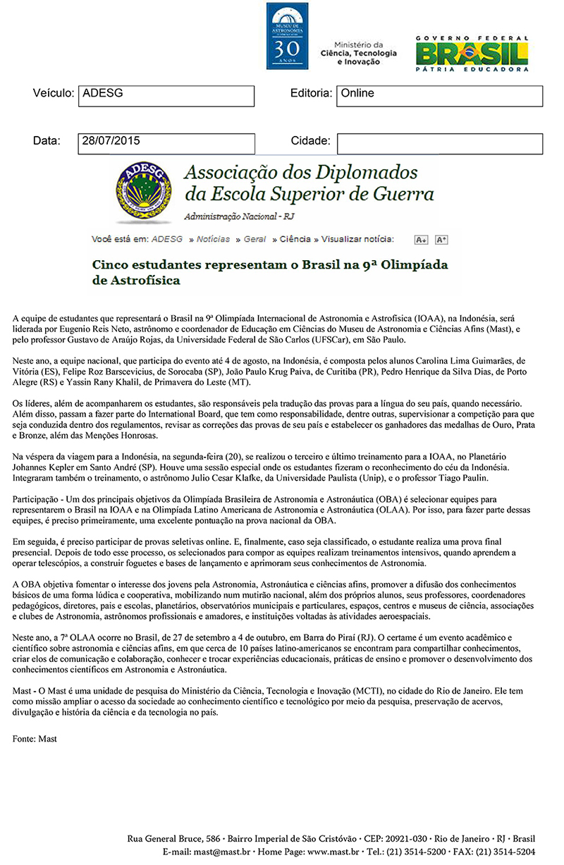 ADESG | Cinco estudantes representam o Brasil na 9ª Olimpíada de Astrofísica