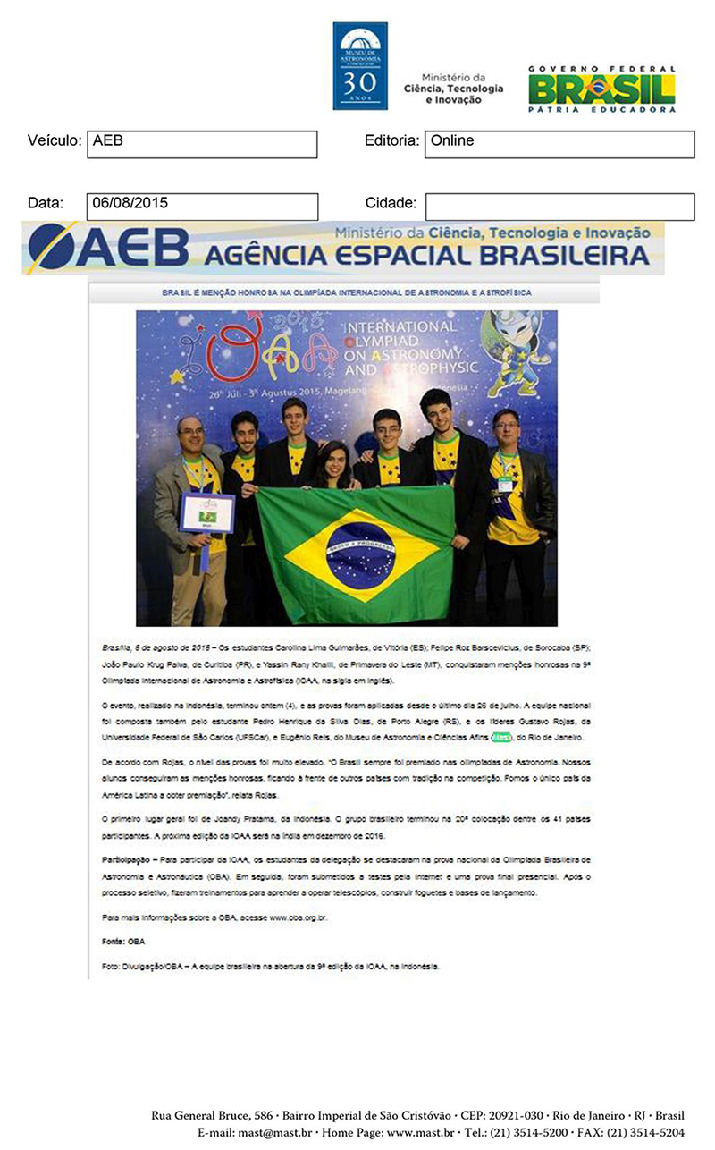 AEB | Brasil é Mensão Honrosa na Olimpíada Internacional de Astronomia e Astrofísica