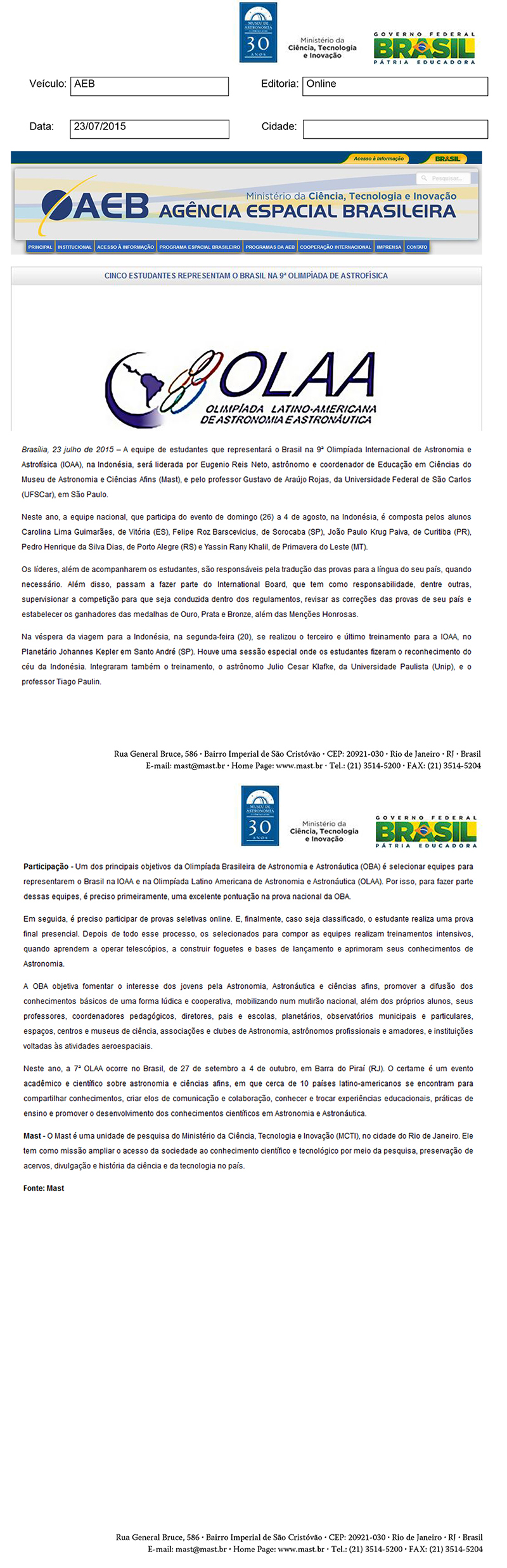 AEB | Cinco estudantes representam o Brasil na 9ª Olimpíada de Astrofísica