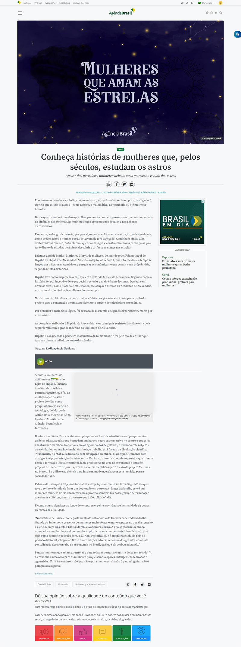 Agência Brasil / EBC | MAST na reportagem 'Conheça histórias de mulheres que, pelos séculos, estudam os astros'