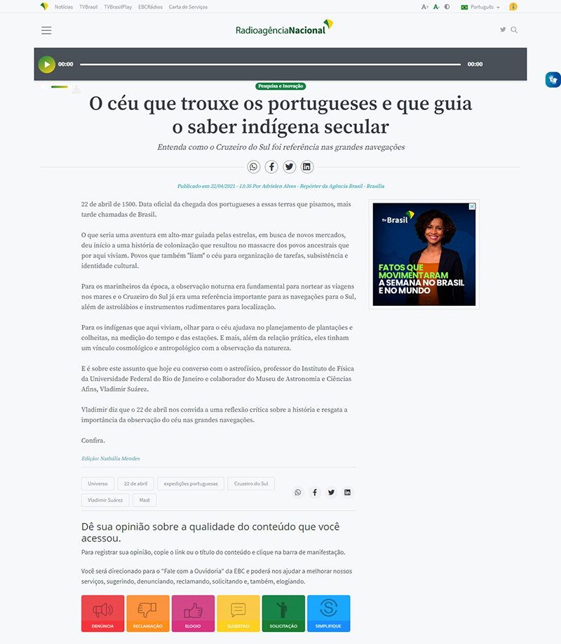 Agência Brasil | MAST na reportagem 'O céu que trouxe os portugueses e que guia o saber indígena secular'