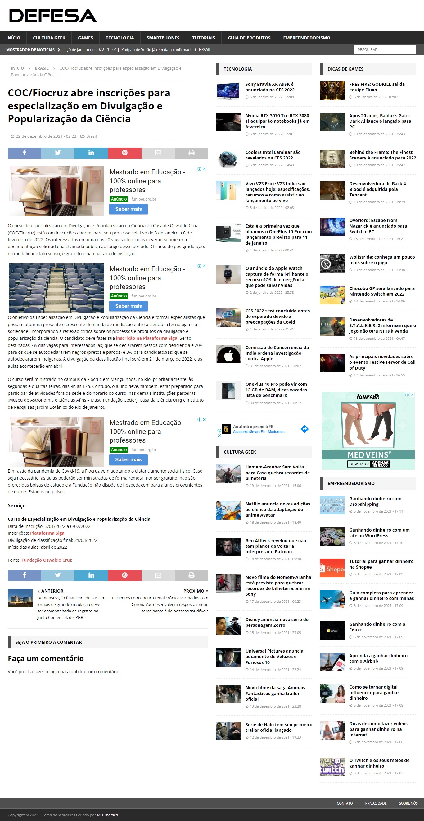 Agência de Notícias Defesa - COC/Fiocruz abre inscrições para especialização em Divulgação e Popularização da Ciência, em parceria com MAST, Fundação Cecierj, Casa da Ciência/UFRJ e IPJB
