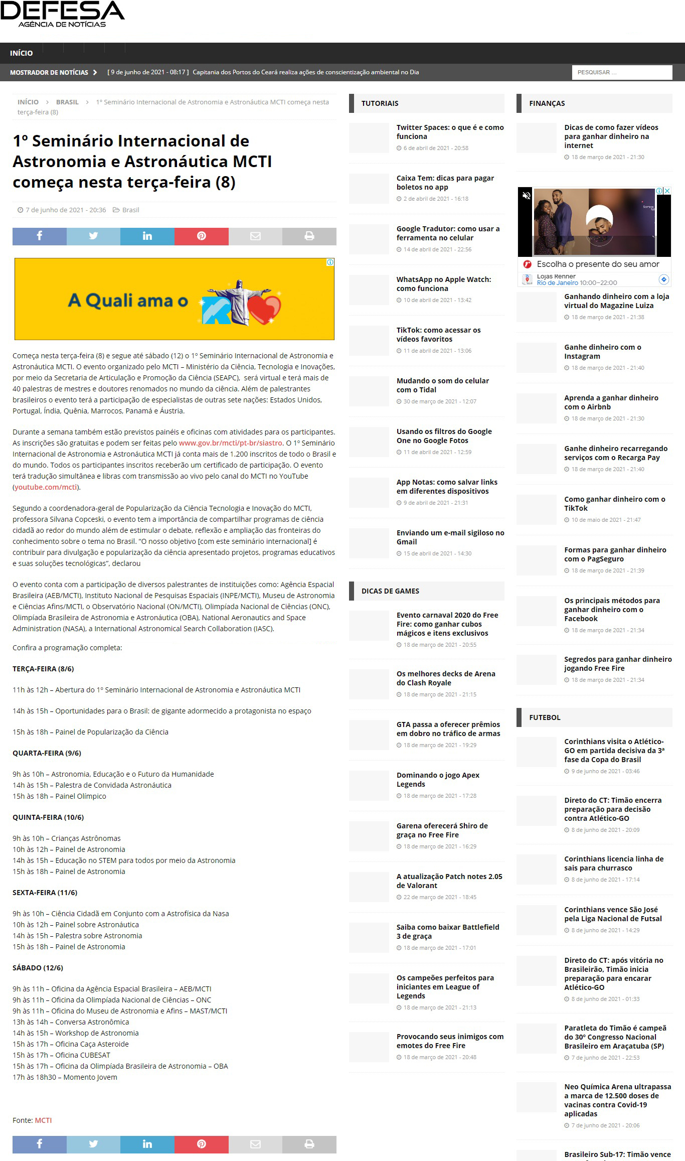 Agência de Notícias Defesa - MAST na 1º Seminário Internacional de Astronomia e Astronáutica MCTI começa nesta terça-feira (8)