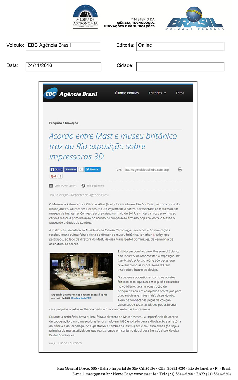 Agência EBC | Acordo entre MAST e museu britânico traz ao Rio exposição sobre impressora 3D