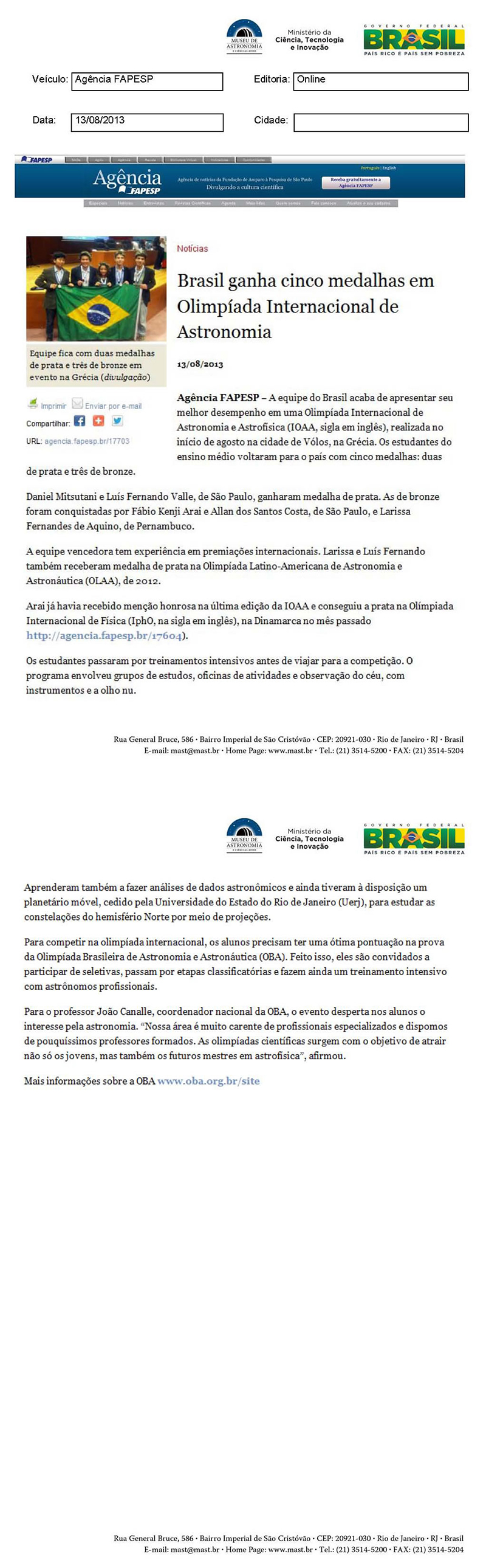Agência Fapesp | Brasil leva cinco medalhas na Olimpíada Internacional de Astronomia