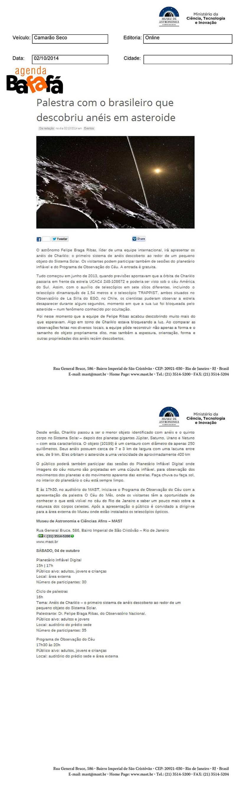 Agenda Bafafá | Palestra com o brasileiro que descobriu anéis em asteroide