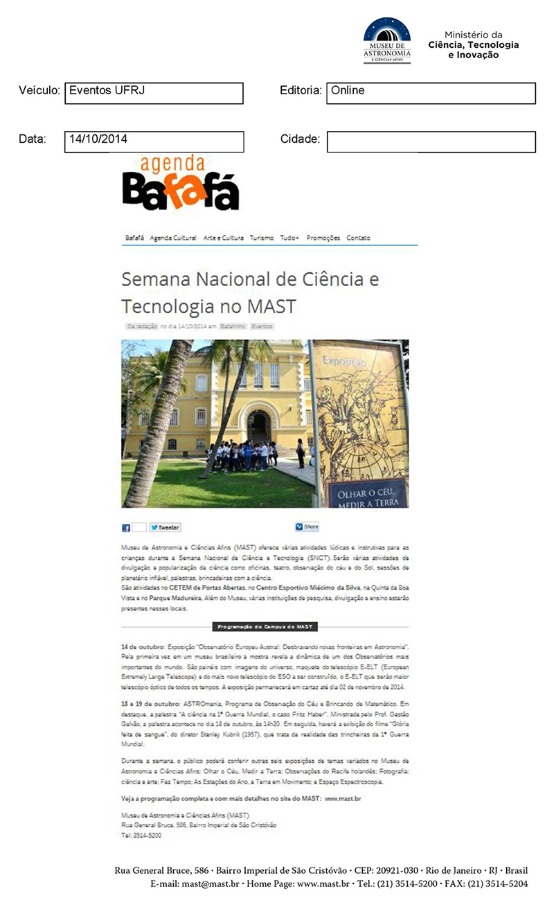 Agenda Bafafá | Semana Nacional de Ciência e Tecnologia no MAST