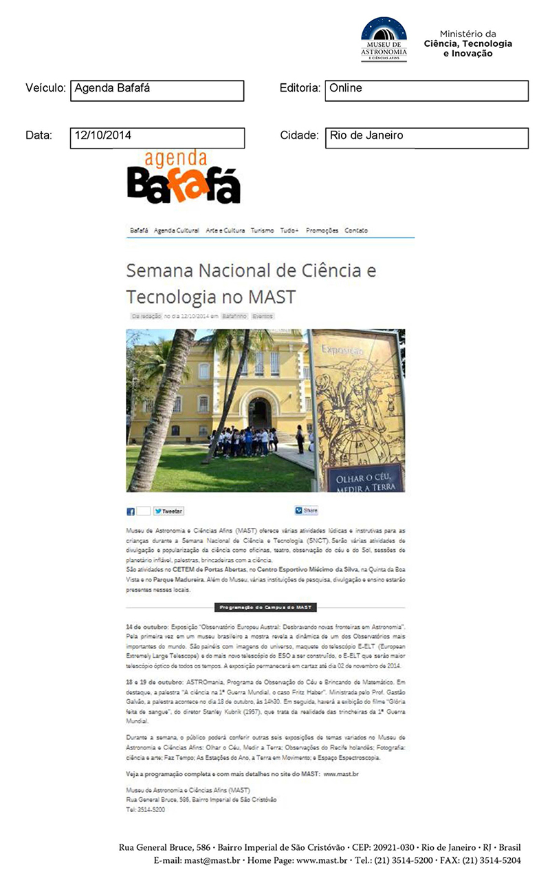 Agenda Bafafá | Semana Nacional de Ciência e Tecnologia no MAST