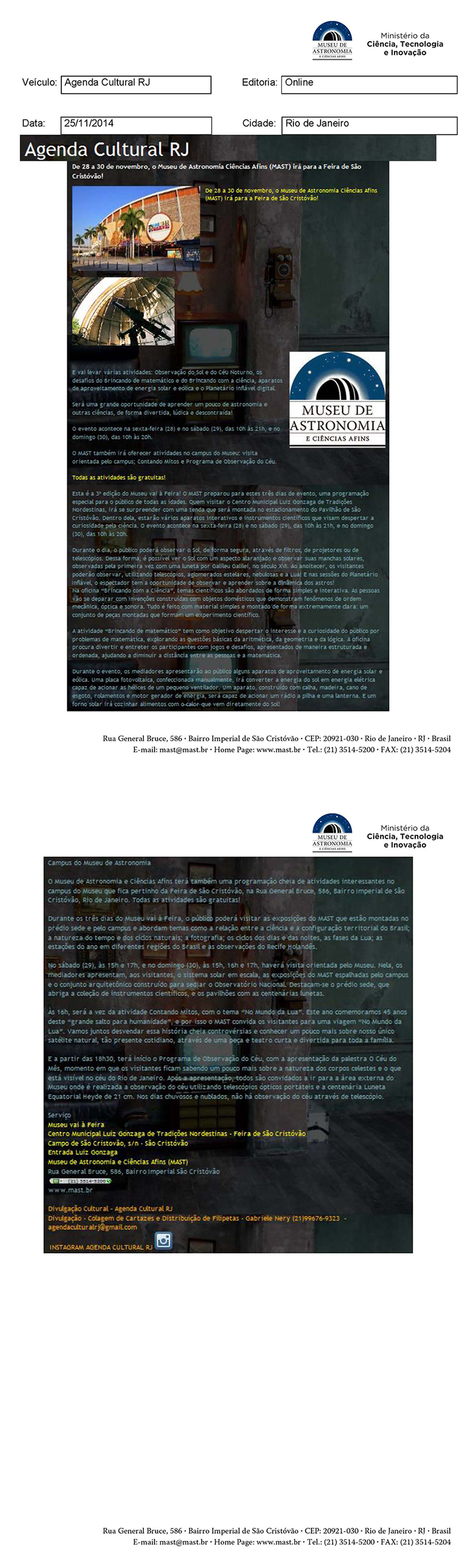 Agenda Cultural RJ | De 28 a 30 de novembro, o Museu de Astronomia e Ciências Afins (MAST) irá para a Feira de São Cristóvão