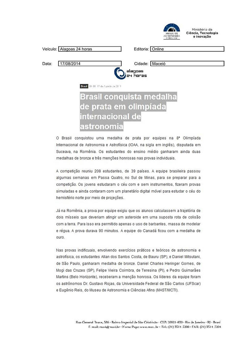 Alagoas 24 horas | Brasil conquista medalha de prata em olimpíada internacional de astronomia